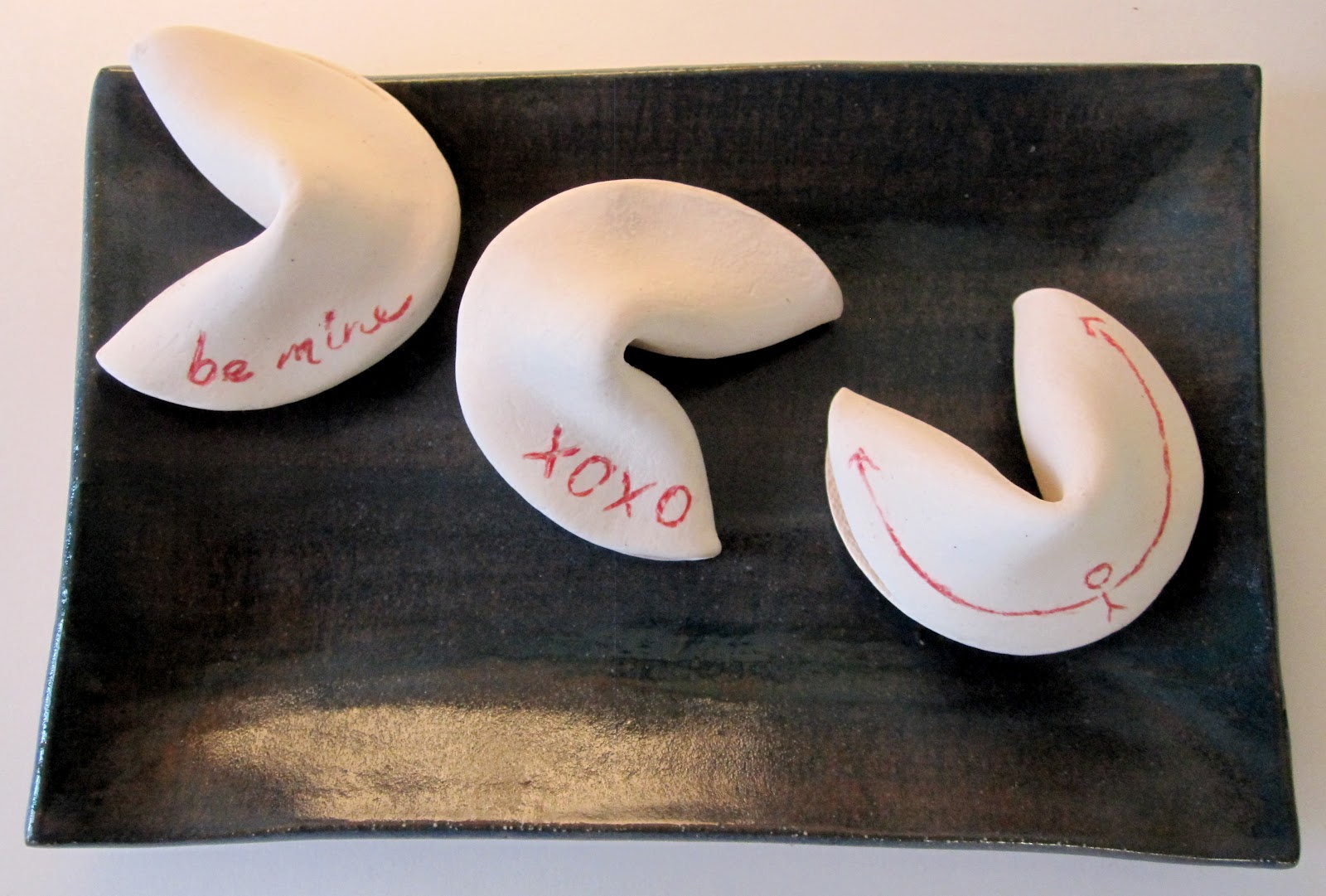 Dad's story gave me a bit of inspiration back in the studio and I crafted these little ceramic fortune cookie ornaments. You don't have to break open the cookies to get to the fortune which pokes instead out the top, and they do not predict a king of the ice carnival. Each cookie offers a different bit of destiny and good cheer straight from favorite carols, in one of ten variations....